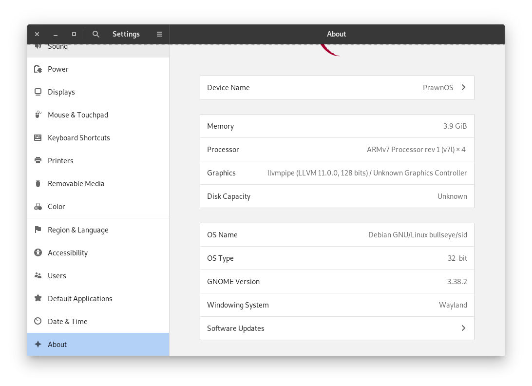 Gnome Settings: About shows that LLVM graphics is being used (Panfrost + Wayland) #254